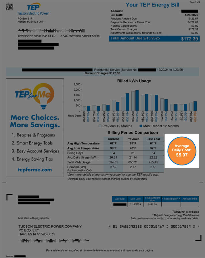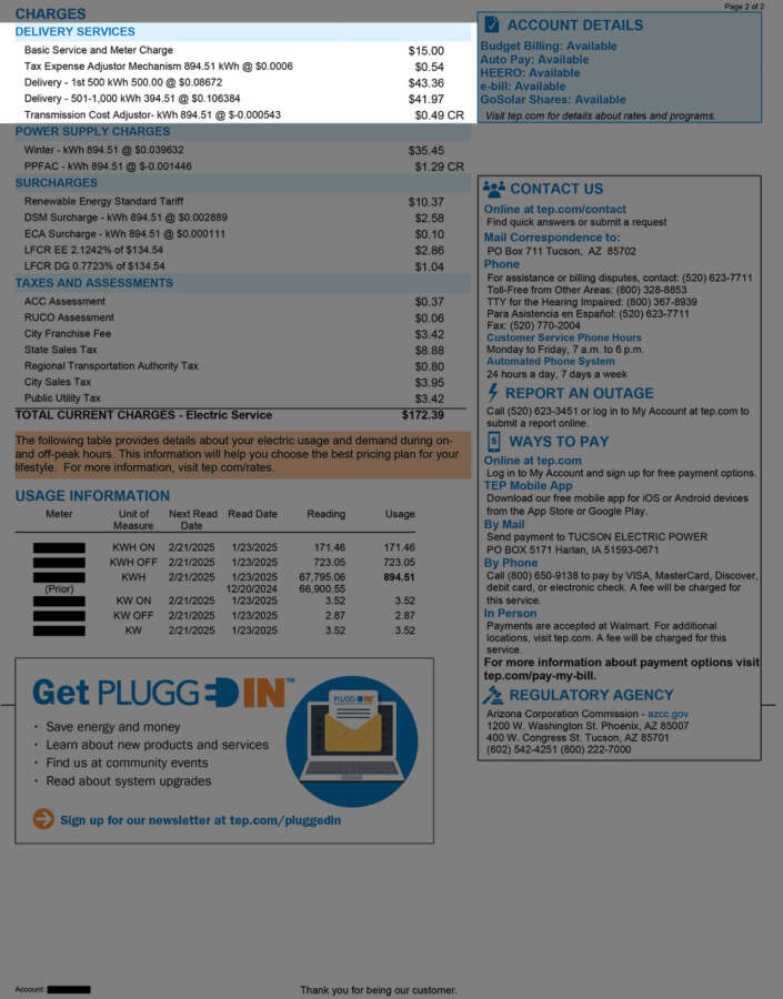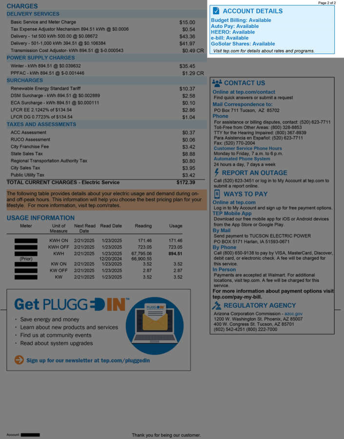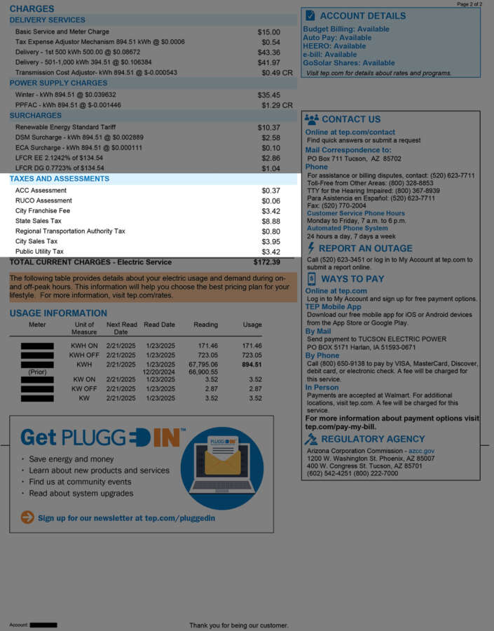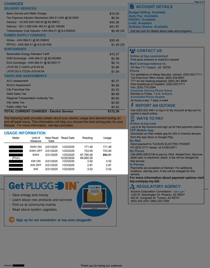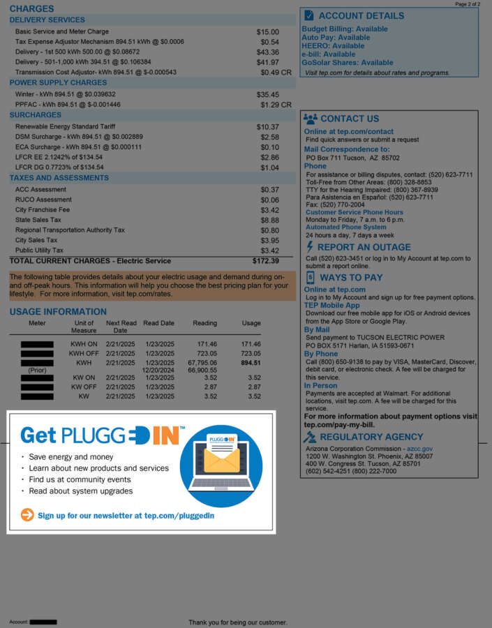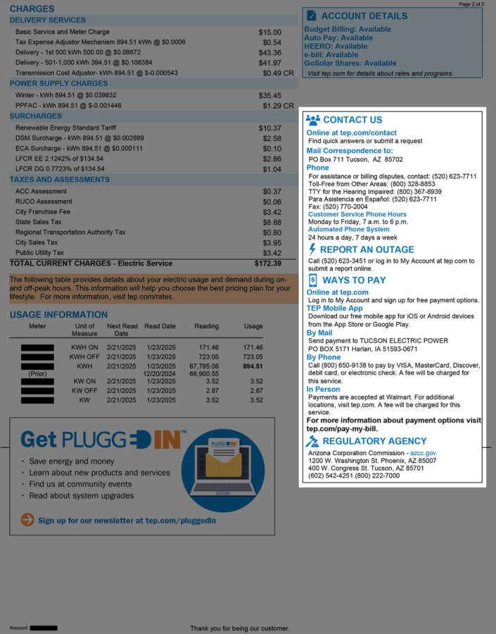 This section of your bill includes contact information for TEP and the ACC, ways you can report a power outage and the multiple ways that you can pay your bill.