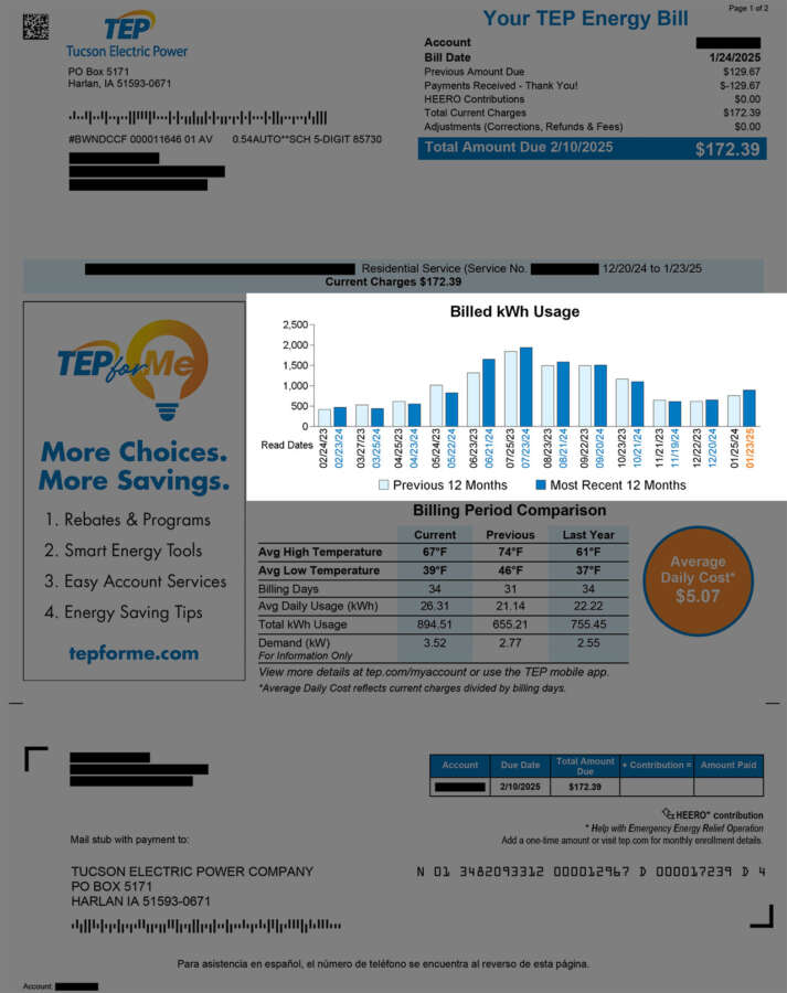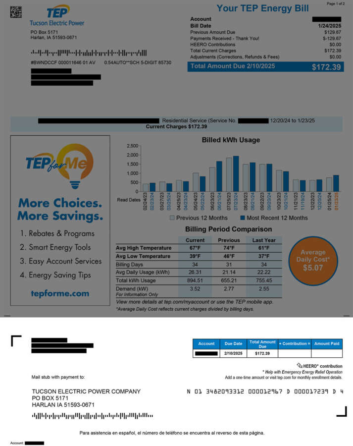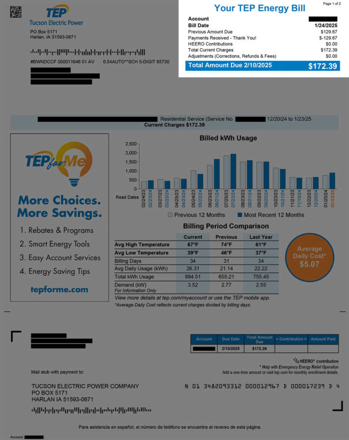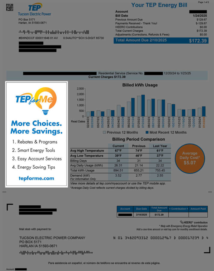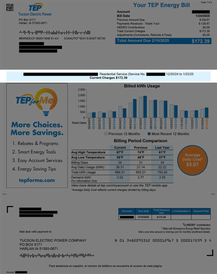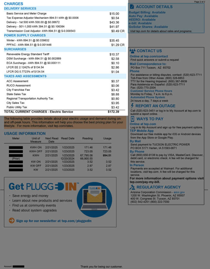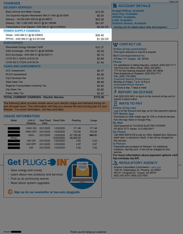 This section of your bill includes contact information for TEP and the ACC, ways you can report a power outage and the multiple ways that you can pay your bill.