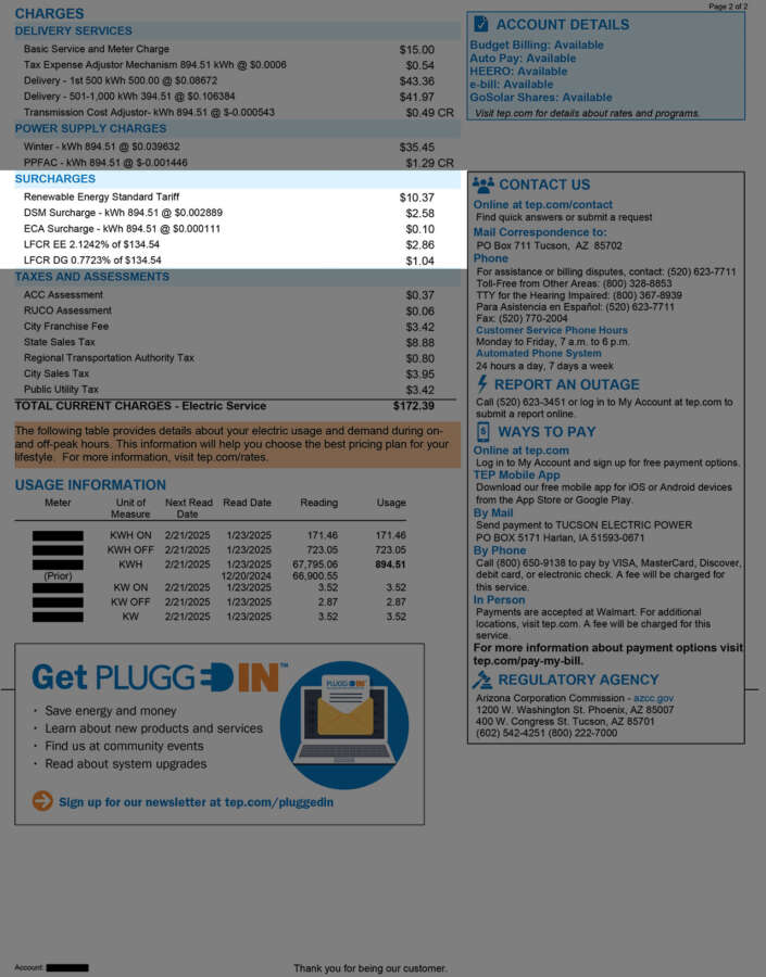 TEP's rates reflect the cost of providing safe, reliable electric service to our customers. They also reflect the complexity of that task, with fixed charges, usage-based charges and surcharges that can be difficult to understand. The following summary offers explanations for the terms and graphs you'll find on your monthly bill, including links to details posted elsewhere on this website.